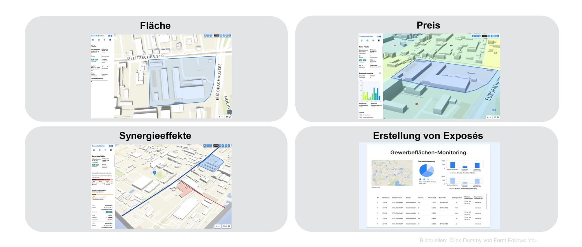 Hauptfunktion: Erfassung, Pflege und Visualisierung von Standort- und Umgebungsdaten; Vereinfachung von Verwaltungsprozessen für Gewerbeflächenentwicklung und Ansiedlungsprojekte