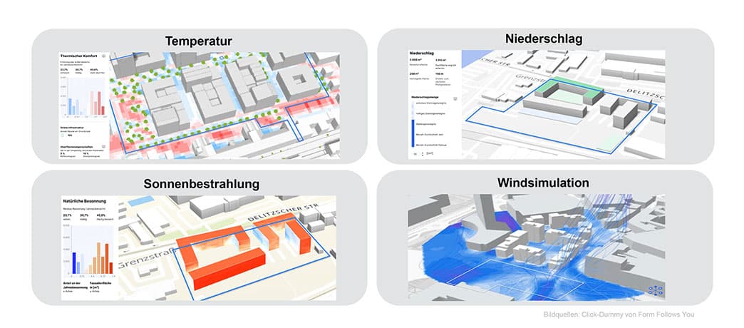 Hauptfunktion: Wie wirken sich Temperaturen, Niederschlag, Sonneneinstrahlung oder Wind auf ein Gebäude aus? Das Tool auf Basis eines digitalen Zwillings soll es ermöglichen, ökologische Wechselwirkungen bereits im Planungsprozess darzustellen.
