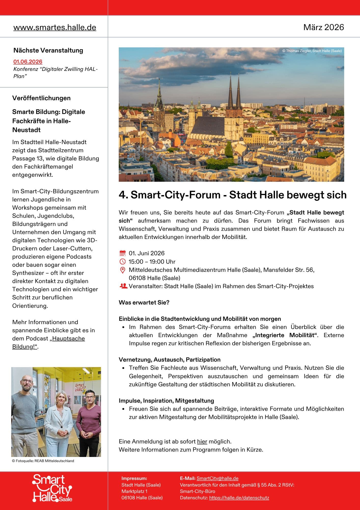 Mit dem Infobrief März 2026 informieren wir Sie über aktuelle Entwicklungen im Projekt Smart City Halle (Saale). Freuen Sie sich unter anderem auf das kommende 4. Smart-City-Forum – merken Sie sich den Termin bereits jetzt vor.